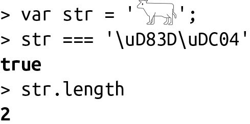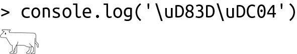 There are many nice Unicode symbol tables on the Web. Take a look at Tim Whitlock’s “Emoji Unicode Tables” and be amazed by how many symbols there are in modern Unicode fonts. None of the symbols in the table are images; they are all font glyphs. Let’s assume you want to display a Unicode character via JavaScript that is in an astral plane (obviously, there is a risk when doing so: not all fonts support all such characters). For example, consider a cow, code point 0x1F404: .